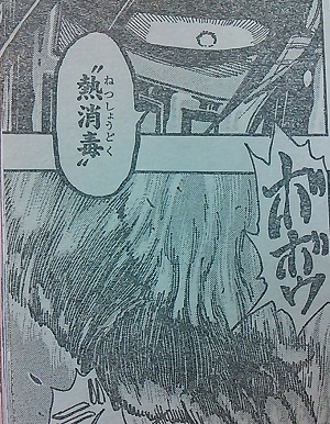 いつかは出るかと思ったけど、「釘パンチ」「フォーク」の複合技がここに来て登場。アルティメットルーティーンによる、スタージュンの腹を貫通するイメージ!「火盾。」結構前に使っていた熱消毒・キャンプファイアーに続く、3つ目の炎系の技。温度は鉄の沸点2800度を超えています。ならばと、四方八方からのフォーク釘パンチ!ディオ、プッチが投げたナイフより多いぜ!今週のベストシーン!ここに来て腰の剣を抜くスタージュン。一振りでフォークを焼き溶かす。「見えたのは…どんなイメージだ?」まだまだ続きます。