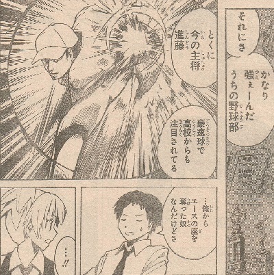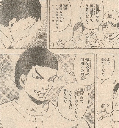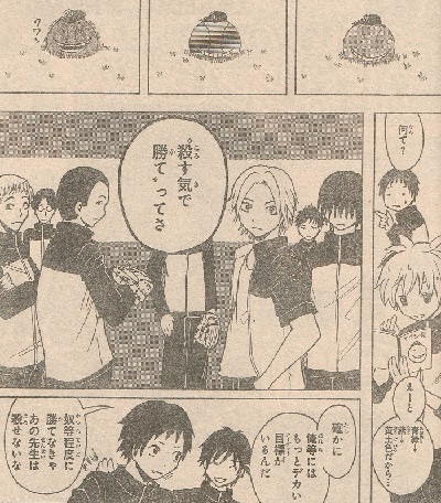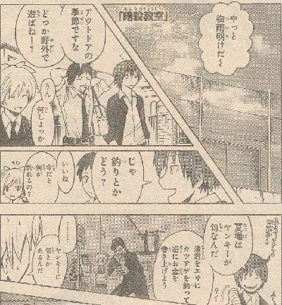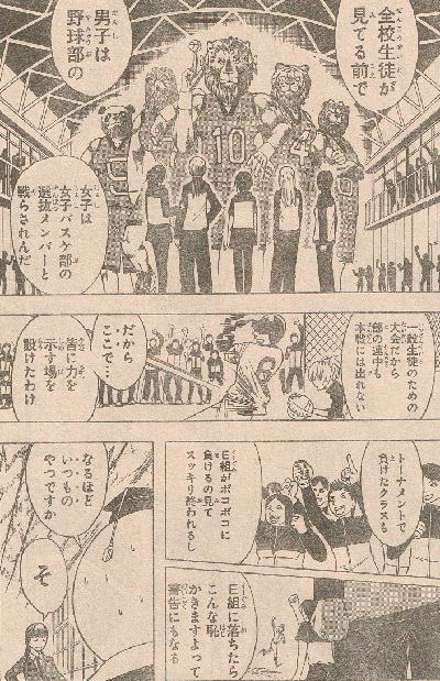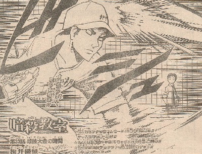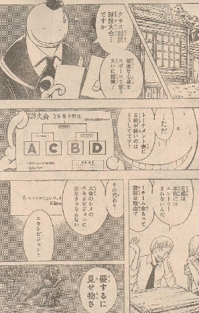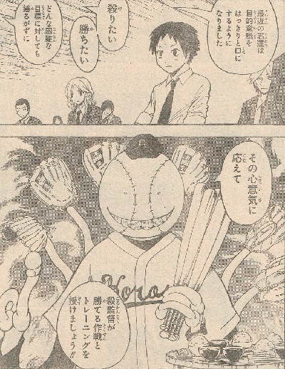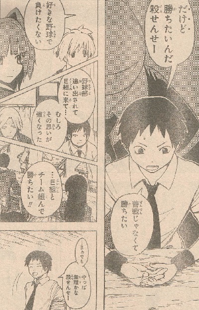 イトナが転入早々校内暴力をして間もない梅雨明け。これから暖かくなってくる季節が今回の舞台。真夏のスポーツの代名詞とも言える、高校野球。杉野はグラウンドを見つめます。もはや見慣れた「E組」の偏見・差別。勉学だけではなく部活動内でも馬鹿にされる始末。「来週の球技大会で教えてやるよ。この年で開いてしまった大きな差をな。」学生時代のイベントの一つでもある「球技大会」。一般的にはその球技の経験者・未経験者問わず混じって行われるものですが、この学校では、エキシビションマッチにE組 VS 部の選抜メンバーとの試合を設けている素晴らしい差別的イベントが開催。先ほどのピッチャーは杉野からエースの座を奪った人物。名前は進藤。「だけど勝ちたいんだ殺せんせー。善戦じゃなくて勝ちたい。好きな野球で負けたくない。」E組に、スポ根の殺監督が就任。ちゃんとちゃぶ台が用意されています。男子は野球。女子はバスケットボール。残り一週間でエリートをぶっ潰す!そして当日。優勝はA組。敗退したB~D組は少しでも気分を晴らそうとエキシビションマッチを観戦。両チームのキャプテンが睨み合います。監督は外野のボールに擬態をしてサインを指示するポジションへ。青緑→紫→黄土色のサインは、「殺す気で勝て」!あくまで彼らの最終目標は先生の暗殺だから、1つの通過点であるこの試合は勝って当然。E組は変わって来ましたね( ´∀`)。