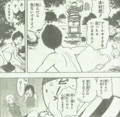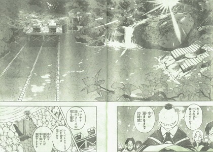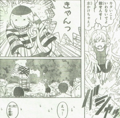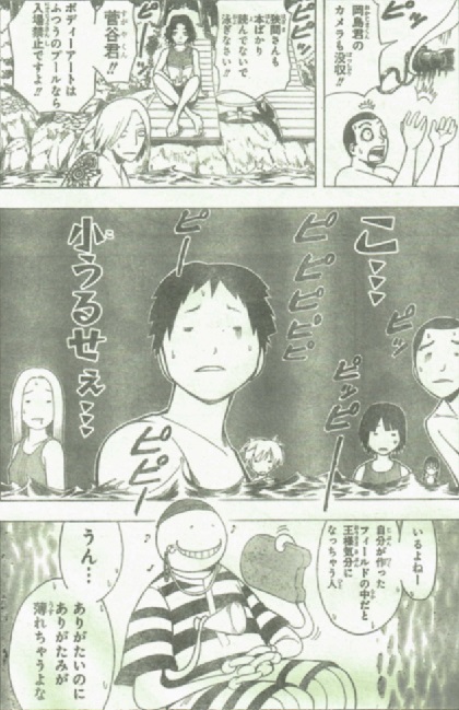 我々の現実世界も、だんだんと暑くなって来ましたね。暗殺教室の世界観は、真夏に入りました。見てるだけで暑苦しいです。そんなE組の生徒たちに朗報。殺せんせーが裏山の奥にご案内。そこには、一日かけてできた即席のプールが!「バッチリ25Mコースの幅も確保。シーズンオフには水を抜けば元通り。制作に一日。移動に1分。あとは1秒あれば飛び込めますよ。」ん~気持ちよさそう!しかし、心臓がビックリするので飛び込みは大変危険です。笛の音うるせぇ!不意打ちで水を浴びせられる殺せんせー。ん??「きゃん」??ここにきて、意外な弱点判明。それは、水。でも、イトナは雨弾いていたけど?水泳で活躍しそうな人物。球技大会で女子のバスケをしきった片岡さん。水で殺せんせーの動きを封じる役目になる予感が。