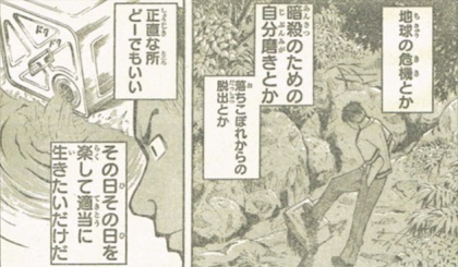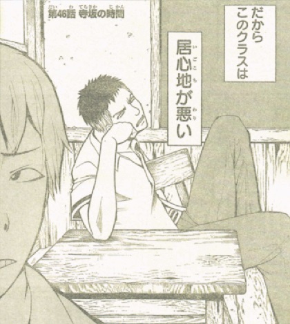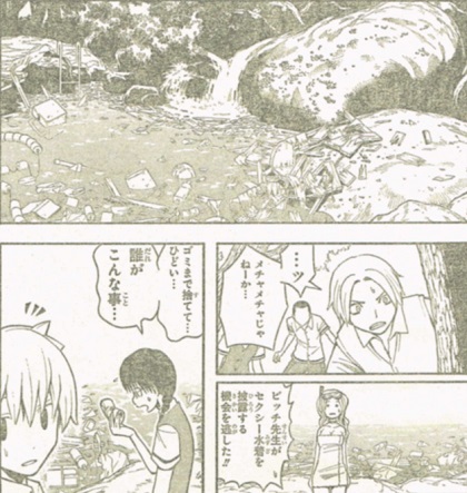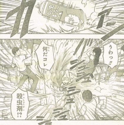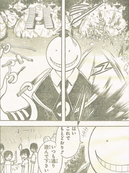 今週号の一枚目のセンターカラー。何やら特別企画が始動。来月7月4日に発売する、コミックス5巻の巻末企画特別ページにて暗殺教室×SCRAPパズルの時間が始まります。って予告です。タイトル通り、今回からE組の不良キャラ・寺坂君を軸にしたお話のようで。先週の一番最後の描写の通り、E組専用プールが破壊されました。もちろん犯人は寺坂・村松・吉田の不良三人組。久々に登場したビッチ先生がボー然…。しかしタコにかかれば、文字通り「あっという間」に修理が可能。タコがいる限り、間接的な嫌がらせは意味ないね('A`)y-~。不良仲間の村松・吉田さえもタコ派になっていき、自然と孤立する寺坂。プール破壊の次は、教室に殺虫剤を散布。お次はプールに薬剤を混入。ここまで来たら、ヤンキーじゃなくて悪だね。「プール破壊・薬剤散布・薬剤混入。君のお陰で準備ができた。ご苦労様。」真の黒幕は、イトナの保護者シロ。準備ってなんじゃろ?シロが出てきたからには、イトナは復学するのかな?