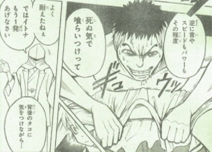 E組の策士・カルマの策は、原さんはほっとこう!殺せんせーの頭上で今にも落ちそうなデブポッチャリは後回しにしようという作戦。「俺を信じて動いてよ♡」と全員に提案するカルマ。「てめえ俺とタイマン張れや!」利用されていたことに激怒し、シャツ一枚で戦おうとする程馬鹿ではありませんよ。演技です。この学生Yシャツは昨日着ていたもの。イトナの一撃を真正面から食らう!死ぬ気で食らいつき、動きを止める。昨日着ていたってことは、教室内で散布された特殊薬剤をモロに被っているってこと。イトナもせんせーも弱点は一緒。一瞬の隙をつき、原さんを救出。「殺せんせーと弱点一緒なんだよね。じゃあ同じ事やり返せばいいわけだ。」クラス全員から歓迎(?)の水浴び!若い頃を思い出すね。流石に潔く出直すシロとイトナ。この一件で寺坂も変に突っ張ることはなくなるのかな。そして最後の一点。「最大の弱点」?どうせ「E組の生徒」とか書くんじゃないの?