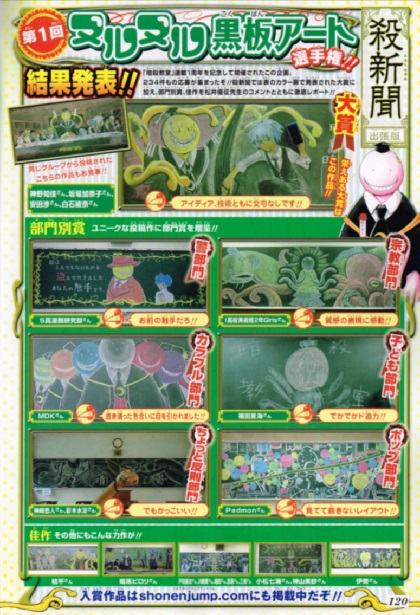 今週号は敬老の日の都合により、土曜日発売です。今週号は42号になります。表紙は新連載第1弾の「HACHI」。・巻頭カラー…HACHI・センターカラー…暗殺教室・銀魂「ムヒョとロージーの魔法律相談事務所」「ぼっけさん」と続くオカルト系第3弾。ムヒョロジは3年ちょっと続いたけど、ぼっけさんがすぐ終わったからな…。西先生ワールドの復活楽しみにしてます。そして企画の発表あり。暗殺教室発の企画・「第1回ヌルヌル黒板アート選手権」の結果発表。大賞受賞作はセンターカラーになっています。この発想はなかった…!その他部門は↓こちら。↓どれも綺麗ですね。 漫画感想は明日からお送りいたします。