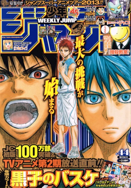 2週連続の祝日による土曜発売が終わり、通常の月曜日発売になりましたね。今週号は44号になります。表紙は第2期アニメが決まった黒子のバスケ。漫画もいよいよ決勝戦開始です。・巻頭カラー…黒子のバスケ・センターカラー…恋のキューピッド 焼野原塵・ニセコイ・連載終了…銀河パトロール ジャコ・付録…黒子のバスケ 漫画×アニメコラボポスター付録はちょっと大きめのポスター。コミックの初版100万部突破&第2期TV開始直前イベント。そして、センターカラーの小野寺さんアップが良かったヾ(o´∀`o)ノ♪さて、今週号で短期集中連載が終わる「銀河パトロール ジャコ」。先週号の最後の最後に、まさかの人物が登場と書いてありましたが… ここにきて悟空&ブルマをぶち込む大胆さ!!なんと時系列はDBの世界観と同じなのであった。鳥山先生、お疲れ様でした。漫画感想は、漫画感想は明日からお送りいたします。