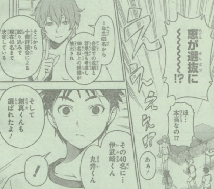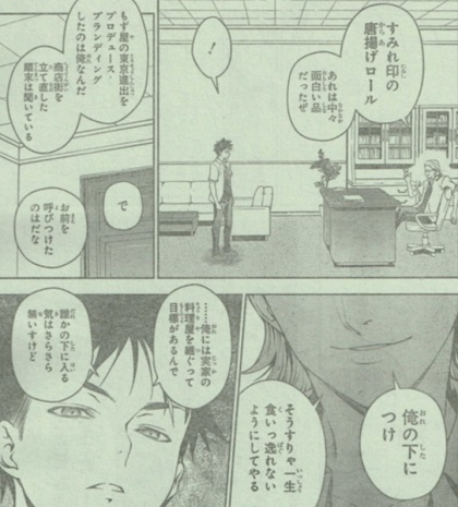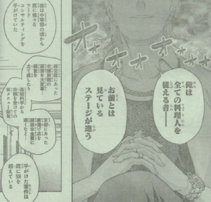 合宿後に出た新キャラ。この巨乳の中華のねーちゃん。初登場じゃないんです。 43号に出てました。管理人もすっかり忘れてた。「中華料理」にカレー料理か…全く見当もつかない。まあ、「珈竰(カーリー)」って言葉があるぐらいだから、読者をビックリさせる料理を考えているんでしょう。