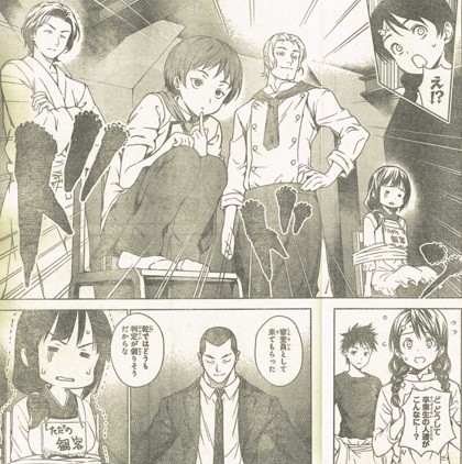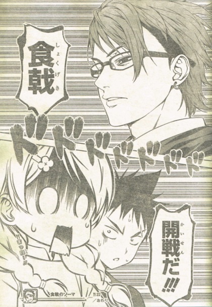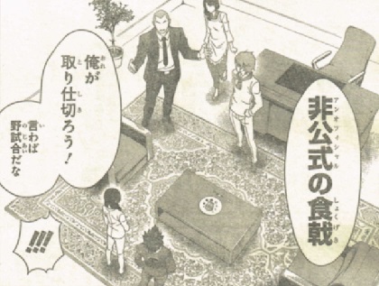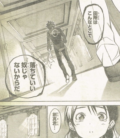 先輩に喧嘩をふっかけたソーマ。しかし全く乗らない四宮シェフ。そこにいいタイミングで登場する総支配人。非公式の食戟を提案。勝負は午後に決定。なんとか首の皮一枚繋がった田所ちゃん。小悪魔的な描写(・∀・)イイネ!!一応学生です。どの立場で言ってんの?ある意味最高のおせっかいさん。午後の課題を終え、食戟の舞台へ。場所は今回の研修で使うことのないホテル別館の地下料理室。食戟のルールを今一度ざっくり確認。双方の合意と奇数名の判定員で成り立つ。今回の判定員はOB達。寿司職人・イタリアンシェフ・オーベルジュ経営者の3人かな。乾さんはただの観客笑イタリアンシェフはDEATH NOTEのLとキャラ被る。総支配人が仕切る非公式の食戟開始!ルールは、昼の課題で余った食材を使い、田所ちゃんがメインで調理、ソーマがサブ。さてさてどうなることやら。