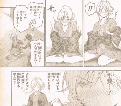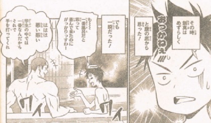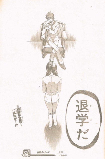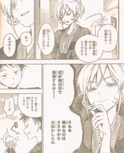 温泉に向かうソーマと、温泉から出てきたえりな。うっかりぶつかった所から。相変わらずのツンツン。可愛くねえな。一日目の試練でさえ、「退屈な行事」と一言。おまけに、ソーマに対しての嫌味。でも、彼女自身相当レベルが高いのも事実。風呂から上がっているということは、ソーマよりも50人前をクリアしたということ。ようやく風呂に入れたソーマ。しかしまた先着が。その人物は、当ホテルの総支配人。別画像はこちら。ナイスバディ!やっぱり、男は裸の付き合いですね。年齢問わず、すぐに打ち解けられます。極星寮組、なんとか全員初日をクリアした模様。シャーマンキングの主人公みたいな声を出しながらリラックスしています。明日に備え、就寝。そして迎えた二日目。ん?田所ちゃんどうして泣いてんの?先輩から放たれる無慈悲の一言。退学。次週理由が明らかに。