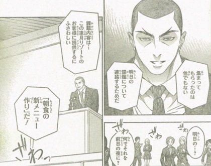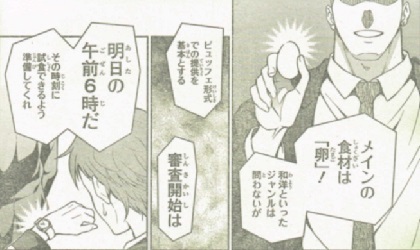 ついに、最終試験が始まる。学生達はランダムに会場を振り分けられる。審査員は、遠月が提携している食材の生産者とその家族。加えて、遠月リゾートで働いている現場の人々。正にホテルの朝食を再現したテスト。ターゲットは好みの違う老若男女ってことです。エグい条件だなぁ~。ほぼ徹夜の状態から、二時間以内に200食達成か…管理人が目をつけた二品。田所ちゃんの「朝食おでん」と、下の方は薙切ちゃんの「エッグベネディクト」。うずらの卵と、下の方は隠し味にカラスミを使ったもの。鳥の卵と、魚の卵という発想に一票。おいどうした主人公!遠月に来て、初めての挫折か?