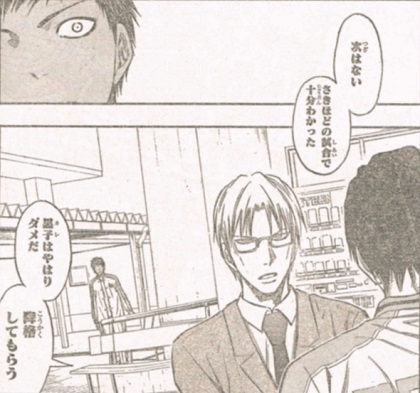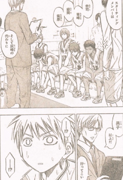 地区内での対外試合開始。スタメンは「一年のみ」。灰崎は仮病で、黒子が緊急参戦。早々ミス。「潰すよ?」と紫原。初試合って緊張しますが、チームメイトとしてひどくね?休憩中に、青峰は見てしまった!「次はない。彼は降格だ。」黒子、ピンチ!