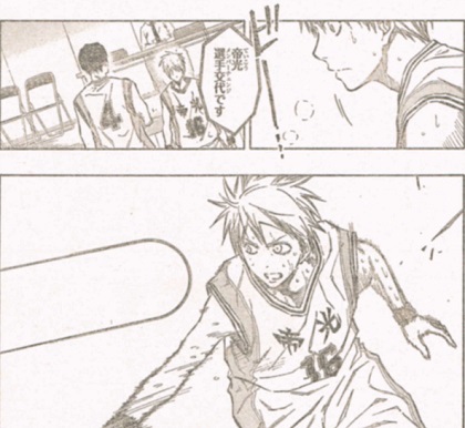先の試合で勝利し、文字通り結果を残した黒子。しかしまだユニフォーム=背番号はまだもらえず。一年生のみの交流戦なので、赤司達も貰っていない。しかし、実力的には1軍として認められた!数カ月後。一軍に慣れた黒子。晴れて二年生になりました。青峰と一緒に体育館へ。青峰長谷が結構伸びました。今一度書きますが、この回想は中学二年生の時です。その日の練習風景。キャプテン・虹村と青峰のワン・オン・ワン。青峰がキャプテンを抜く瞬間!青峰だけでなく、赤司・緑間・紫原等も確実に実力をつけ始める。そして、黒子も。この頃から、世間体に「キセキの世代」が広まりつつあります。2年生の成長率に合わせ、今後の試合は2年生メインに。実力的にもう2年生が上ってことかな?3年生達はめっちゃ悔しいだろうな…。そして同時期、黄瀬涼太が入部します。バスケを初めて、この時点で2週間目です。この世代は本当に異端児だらけだな(^_^;)練習後、密かにコーチと面会するキャプテン虹村。「部のために、俺にとっても赤司をキャプテンにして下さい。」