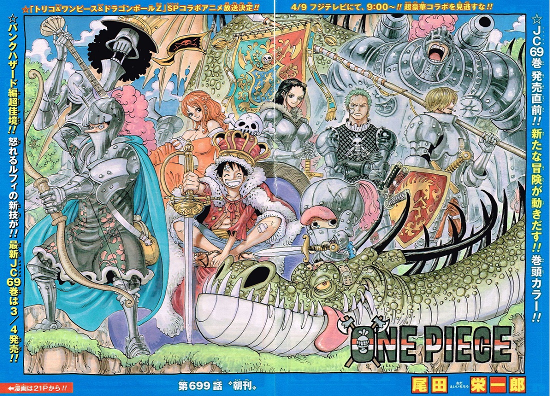 スモーカーを始末する寸前に、元海軍大将・青キジことクザンが登場。クザンは2回目のパンクハザード。とどめを刺そうとするドフラミンゴを、ヒエヒエの実の能力で凍らせて止めます!続いて海兵達の足元まで広範囲に凍結!確実にドフラミンゴを止めてスモーカーを守りますが…能力者対能力者の戦いです。加えて七武海という実力者。この程度で終わるドフラミンゴではありません。凍結状態を破ります。まあ、ドフラミンゴ的にはカイドウとの取り引きがありますからね。モメてる場合ではありません。戦闘は避け、部下の解放へ。「一つ教えてくれるか。お前今…!!何者なんだ!クザン!いい評判は聞かねェぞ?」「ただの放浪者と何かを決断した男の顔は違う…!!」クザンの目的は一体何なのでしょうか??「海軍に所属しなくとも実行できることはある。所属しねェから見えてくるもんもある。」なぜスモーカー達G5がパンクハザードにいるのかを把握できたかは不明ですが、クザンは忠告しにきた様子。1国王であるドフラミンゴはサカズキ中心の海軍を動かし、大きなことをしでかすかもしれないとスモーカーに警告。また大きな事件が起きそうな予感の伏線ですね。一方麦わら&ロー組。ワノ国の英雄・リューマの墓荒らし騒動の犯人はお前か!と錦えもんが暴れています。ちょっと説明に時間がかかりますね(^_^;)風呂あがりのロビン。oh!ナイスバディ!思えばロビンのこんな笑顔、初めて見るかもです。そしてモモノスケ。テメェ(#・∀・)野郎の下心全開!!ワノクニの人々は子供の頃からドスケベなのか!?そして翌朝。新聞がサニー号に到着。果たしてドフラミンゴはどの決断をしたのでしょうか??結果は「七武海脱退」!世界中で衝撃が走ります。シーザー感激!ドフラミンゴは部下を大事にしますねぇ。ローは思惑通りに事が進み、珍しく笑顔。七武海脱退のニュースに加え、もうひとつの大きなニュースが世界中に伝わります。・「七武海・トラファルガー・ローと麦わらの一味 異例の同盟」・「キッド海賊団・オンエア海賊団・ホーキンス海賊団 海賊同盟を結成」二年前にシャボンディ諸島に集まったルーキーたちの半分が、ここに来て異例の同盟結成。海賊時代、まだまだ動きます。そしてドレスローザの元国王、ドフラミンゴ。ローからの電電虫が鳴る中、一人何を思うのか…。