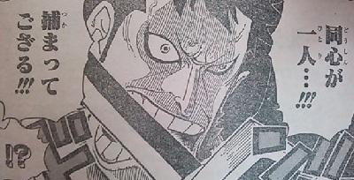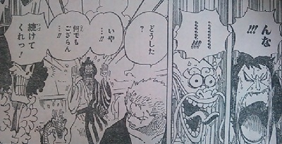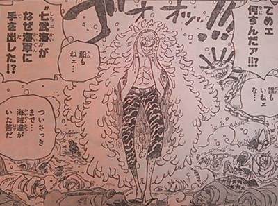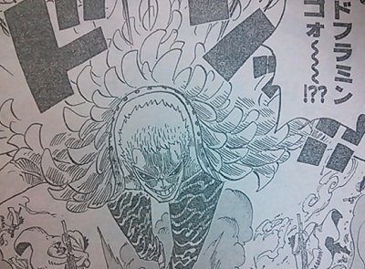 麦わらの一味+ローはパンクハザードを後にする一方、スモーカー達海軍は島に残り続けています。防護服を作ったのはシーザーの敵・ベガパンク。「防護服なんか効きやしねぇ」とシーザーは部下に嘘をつき、兵士は固められていました。タイムリミットは半日。時間内にG5は仲間を助けられるのか?一方スモーカがいる方のG5。ローに切り離された身体部分は海軍が人質に。っと、首が空から飛んできたぁ!?首が戻るというのは、首を戻しにきた人物がいるということ。ベビー5とバッファロのボス・ドフラミンゴが登場。来るやいなや、「覇王色の覇気」で海軍下っ端を一掃。「海軍なのに何故逃がした!?」正論です。笑ドフラミンゴのことを知りすぎたスモーカも一撃!こちらは麦わらの一味トーク。新世界の事情に詳しいローが、いろいろ教えてくれます。新世界の海賊たちは「縄張り」を持ち、無数の部下を従えているという。その新世界の海賊と裏取引をし、現在最も信頼と力を持っているのが、ドンキホーテ・ドフラミンゴ。そしてドフラミンゴが今大きな取引している人物が、四皇の一人”百獣のカイドウ”。カイドウとの取り引き内容は、人造悪魔の実「SMILE」。SMILE製造工場を破壊したローは間接的に、カイドウに宣戦布告をしたことになります。カイドウの名前を聞いて驚く錦えもんとモモノスケ。ワノクニと関係があるのか?一行は「SMILE」製造工場を破壊するためにドレスローザへ進路を決めます。と同時に、錦えもんも暫くの間仲間に。剣士3人目だよ!スモーカにとどめを刺そうとするドフラミンゴの背後に、元海軍大将・青キジが。何用でパンクハザードに来たのでしょうか??