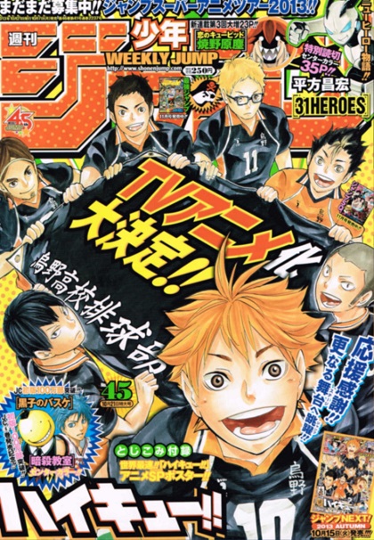 今週号も無事に発売されました。今週号は45号になります。表紙はTVアニメ化が決定したハイキュー!!です。・巻頭カラー…ハイキュー!!・センターカラー…暗殺教室・31HEROES(特別読み切り)・読み切り…31HEROESハイキュー!!のTV放送は来年の4月です。あと半年か…とはいえ、集英社発のバレーボール漫画といえばアタックNo.1以来のアニメ化ですから。(違ってたらすいません)男子バレーの活性化になるのでしょうか。ジャコが連載終了し、久方ぶりの一話完結の読み切り作品の登場。キルコさん作者の平方先生お久しぶりっす。相変わらず巨乳のヒロインを書くのが特徴的な先生です。そして来週、2つの大きな話題が判明。1つ目は、「ONE PIECE」の表紙が清川あさみ先生によるスペシャルイラストであること。2つ目は、岸部露伴シリーズ第6弾!センターカラーっすよコラァ!!漫画感想は明日以降お送りします。