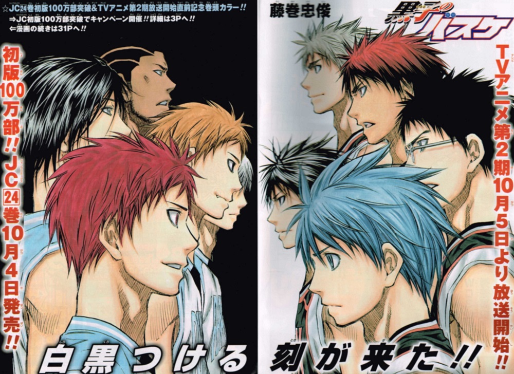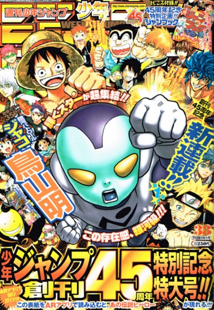 2週連続の祝日による土曜発売が終わり、通常の月曜日発売になりましたね。今週号は44号になります。表紙は第2期アニメが決まった黒子のバスケ。漫画もいよいよ決勝戦開始です。・巻頭カラー…黒子のバスケ・センターカラー…恋のキューピッド 焼野原塵・ニセコイ・連載終了…銀河パトロール ジャコ・付録…黒子のバスケ 漫画×アニメコラボポスター付録はちょっと大きめのポスター。コミックの初版100万部突破&第2期TV開始直前イベント。そして、センターカラーの小野寺さんアップが良かったヾ(o´∀`o)ノ♪さて、今週号で短期集中連載が終わる「銀河パトロール ジャコ」。先週号の最後の最後に、まさかの人物が登場と書いてありましたが… ここにきて悟空&ブルマをぶち込む大胆さ!!なんと時系列はDBの世界観と同じなのであった。鳥山先生、お疲れ様でした。漫画感想は、漫画感想は明日からお送りいたします。