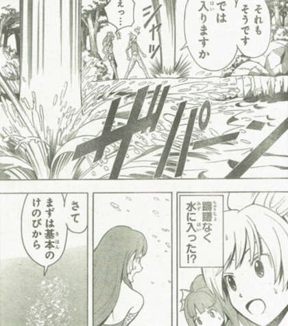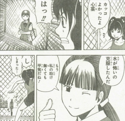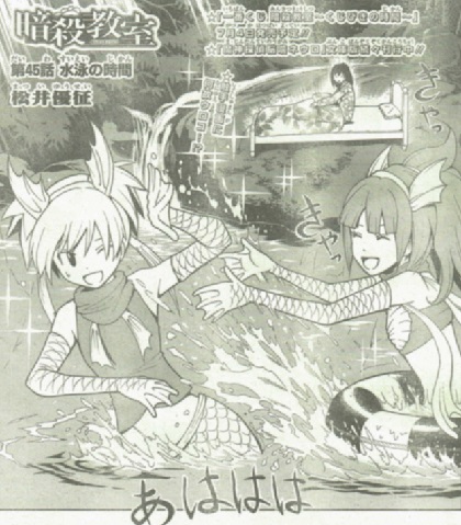 片岡ちゃんを奴隷扱いするこの女。水嫌いを克服すべく、殺せんせー一味はE組の秘密のプールへご招待。「学校へ行こう!」の企画みたいにベッドごと外に放り出されてお目覚め。完全防備で水中に入り、水泳レッスンスタート!流れるプールをマッハ速度で作ります。「ワハハハハ!さっきから『殺せんせー』が水中に渦の流れを作っていることに気がつかねェーのか?おねえちゃん!」ぐったりするのがポイントです。笑殺せんせーと片桐さんの猛特訓のおかげで、泳げるようになった心菜。加えて、水泳の授業でタイムアップ!これで片岡ちゃんに依存することはなくなったね。やっぱり、先生は水が弱点でした。しかし、水に落ちない自信はあるし、水中でもある程度応戦できると豪語。それでも水を利用して暗殺できる可能性は高まりました。