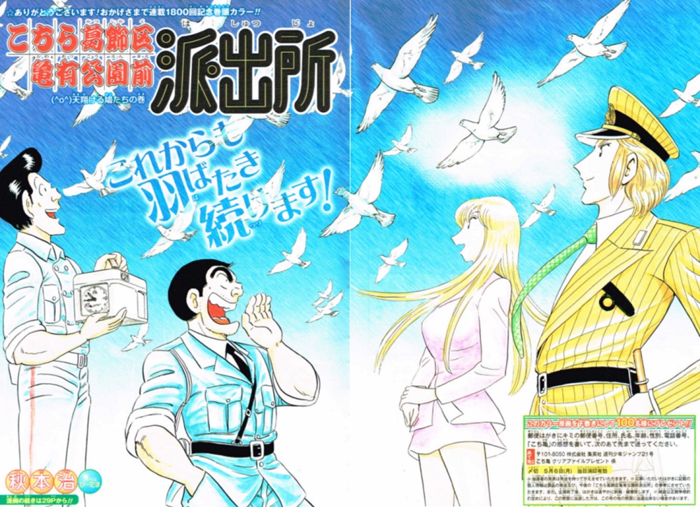 昨日は暗いテーマになってしまいましたね(^_^;)最近ジャンプ記事ばかりだったので、久々にニュース関連の記事を書こうと思いました。今週号も無事発売されました。今週号は21号を迎えます。表紙は皆さんご存知「こち亀」。今週号で1800回を迎えます!!・巻頭カラー…こちら葛飾区亀有公園前派出所・センターカラー…DARK PAWN-闇の質屋-(特別読み切り) ・ ぶらんにゅーSCHOOL DAY(特別読み切り) ・ BLEACH・読み切り…DARK PAWN-闇の質屋-(特別読み切り) ・ ぶらんにゅーSCHOOL DAY(特別読み切り)・付録…ジャンプオールスターズfeat.殺せんせーシール今週号のNARUTOは休載でした。今週号も特別読み切りとして、ベテランジャンプ漫画家が参入。DARK PAWN-闇の質屋-は「ぬらりひょんの孫」作者の椎橋寛先生、ぶらんにゅーSCHOOL DAYは「M0(エムゼロ)」「鏡の中の針栖川」作者の叶恭弘先生です。それでは、今週号も気になった漫画について書いていこうと思います!こちら葛飾区亀有公園前派出所…1話完結タイプの漫画の老舗漫画。今回は「鳩」をテーマに進行していきます。本田と神社で一杯している途中、一匹の鳩に注目した両さん。脚のタグを見て、飼い鳩と見抜きます。タグに記載されている電話番号により、早くも飼い主を発見。以外にも本田の実家の近く。鳩の持ち主の家は、「鳩舎」付きの家。ただ単に飼っているわけではなく、レース鳩として飼育している飼い主。へ~。鳩のレースってあるんだ。陸上みたいに長距離と短距離のレースがあるんですね。そして、レースに勝つには馬と同じく「血統」が重要なんだとか。大会の優勝鳩・上位入賞鳩を交配し、サラブレッドの鳩を卵から育てるという。迷っていた鳩を助けたお礼にと、両さんは鳩を譲ってもらいました。もちろんレースに参加するため。レースには賞金がつきもの。両さんの行動はワンパターンですね。しかし待てども待てども、鳩は帰ってこない。レース途中ですが、「短気なワシにレース鳩は向いていない…」と両さん。鳩の脚に付いているタグを外し、自然に逃がします。しかし、元の飼い主から「育てて売ればお金になる」との連絡が。両さんどんまい!笑めだかボックス…黒神の送別会から10年後のお話へ。安心院さんが亡くなり、10年の節目を迎え「神葬祭」の舞台に駆け込む善吉と鶴喰。毎度おなじみ、扉オープン!からの、女子の着替え。このシーンも見飽きたな…。あ、もちろん悪い意味です。「破壊神」阿久根高貴ももちろん参加。若干26歳で年商数十億の玩具会社の社長に。いやね、いつまでも童心を忘れないというのは、大切なことだと思います。先ほど着替えていた喜界島もがなが、子供を連れて登場。姓が変わっているようですが、誰と結婚したんだろう?個人的にですが、ロンスカ似合うな( ´∀`)名瀬夭歌(くじら)さん、学園のフラスコ計画の統括として在籍。彼女に限らず、他の方々も様々な職業で自分の人生を歩いています。そしてこの漫画の主人公。黒神グループ総帥・黒神めだか。ワンちゃんに囲まれ、幸せな昼寝の一時。いいハンターになれますよ!次週は最終回ですね…。