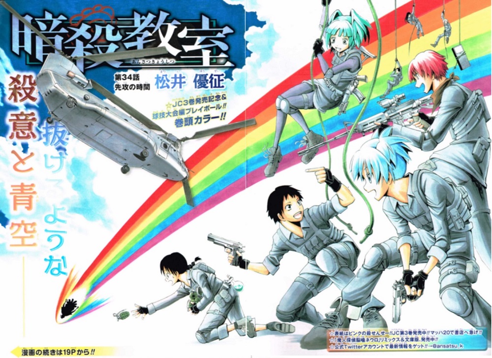 まず最初に書かせて頂きます。いつも私が冒頭に書く「無事に週刊少年ジャンプが発売されました」という言葉。あの災害からちょうど二年たった今日、ジャンプが基本毎週月曜日に発売されているように、当たり前の日常に感謝しなければと自分自身を戒めています。これからも一回一回の更新を大切に取り組んでいこうと思います。今週号の表紙は「暗殺教室」です。地球は我が物と言わんばかりの絵です(^_^;)・巻頭カラー…暗殺教室・センターカラー…ニセコイ・ハイキュー!・読み切り…なしそれでは、今回も気になった漫画について書いていこうと思います。暗殺教室…E組 VS 野球部の試合がスタート。プレイボーイ!中坊の分際で140キロを出す実力者。加えて180㌢もの長身。天が二物を与えた権化のような存在感。改めて書きますが、この漫画の舞台は中学です。E組はパワーで対抗せず、「奇策」メインの戦術。まぁ、殺せんせーが指示しているんですが…。一番打者が行ったのは「バント」。俊足が持ち味の木村が、まず一塁へ。続く二番打者・渚。同じくバントをし、ノーアウト二塁の展開へ。なぜ140キロの豪速球をバントできるかって??それは…140キロの倍の速度の球で練習していたからですよ!走・攻・守完璧な選手がE組にいるってのが野球部最大の誤算。左下の捕手の心理攻撃は笑えたwww。ノーアウト満塁で迎えた状況を、E組以外誰が考えたでしょう。4番バッター・杉野がピッチャーの進藤と睨み合います。「俺が今やっているのは、野球なのか…?」バッターに畏怖する進藤。バントかと思いきや、直前に持ち方を変えてスリーベースヒット!ノーアウトで3失点は結構メンタルきますね。(一見)素人相手に。ここで殺せんせーの宿敵・理事長が参上。試合中なのに選手ではなく、異例の「監督交代」。嵐が吹き荒れるぜ。黒子のバスケ…準決勝が終わり、明日の決勝に備えて戦士たちは休息の時間を。火神の家で過ごします。これから一人暮らしをする人は、気をつけて下さいね。特に野郎の場合、大人数の避難所に使われる可能性が高いですよ。食事を終えたメンバーたちは、黒子の話を聞き始めます。帝光中学の歴史を…。中学時代から目立たない能力が開花している黒子。文学青年だと、緑間と間違われる始末。笑黒子は小学生の時に知り合った友人との約束を果たすため、黒子はバスケ部の門を叩く。入部テストは、1軍~3軍の振り分けから。強者のみが求められる世界。やはり現実は甘く無いですね。黒子は3軍からスタート。友人との約束を守れなかった…。が、諦めずに前を見る姿勢、私は大好きですよ。3軍・2軍の発表に続き、最後の「1軍」の発表。前代未聞の珍事です。今まで1年生で1軍はないのに…。ここに、キセキの世代が集う…!