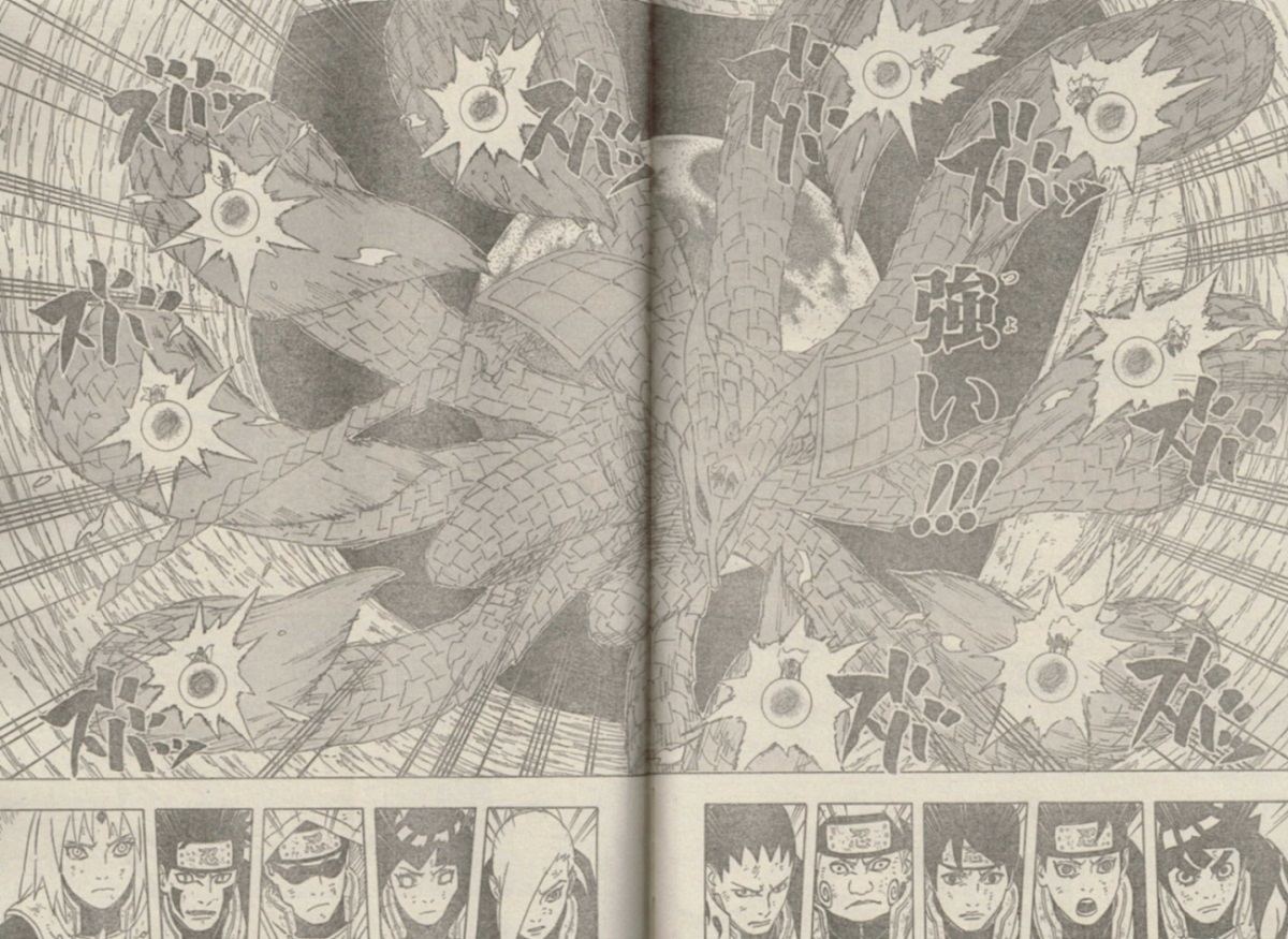 オビトの「ぬのぼこの剣」を砕き、オビトの中の尾獣チャクラを引っ張り出せたナルト。尾獣と仲良くなったとはいえ、すでに封印されていた一尾と八尾は引っ張れないので、我愛羅とビーがお手伝い。 シカマルの作戦で、忍び連合軍全員が尾獣チャクラを引っ張る形に。読者の誰もが、第4次忍界対戦で綱引きするとは思っていなかったことでしょう。